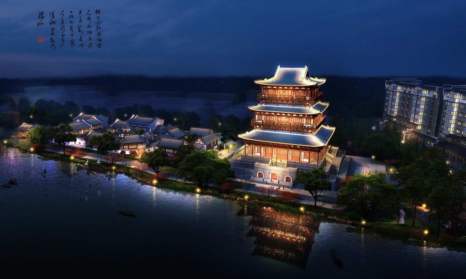 项目概况:项目总占地面积约18000㎡。本地块总平面规划布局,与秦时期的灵渠历史文化景观遥相呼应,在湘江东岸区域延续历时性的时空格局,沿轴线由北向南纵深规划设计明代早中期的魁星楼及文化景观广场,明代中后期的白云驿站,清代初期的白云驿馆,以及清代风格的白云阁及临江楼。规划设计拟复原明代风格的魁星楼,以及明清风格的白云驿、白云阁、临江楼,将兴安的人文历史景观建筑从秦始皇时代一直往后世推演,再现兴安历史较为完整的纵向维度。